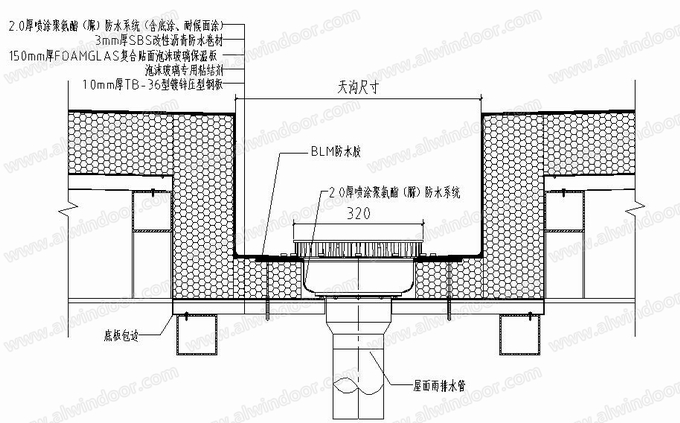天溝分為大小兩種尺寸,較大天溝承擔(dān)拱形屋面的大量水流,較小的天溝承擔(dān)平屋面的水流。天溝底部、兩側(cè)連續(xù)鋪設(shè)泡沫玻璃的防水系統(tǒng),做法與屋面一致。需要特別注意的是在局部設(shè)置虹吸落水管位置存在漏水隱患,因此需要對虹吸進(jìn)行特殊的設(shè)計(jì)處理,虹吸圖示如下: