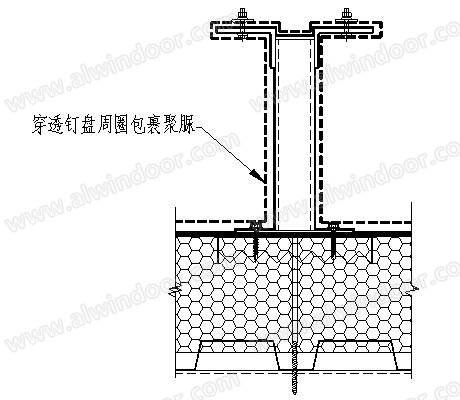 從上圖中可以看出,從上往下依次為25mm蜂窩鋁裝飾板、裝飾板龍骨、裝飾條板連接小立 柱(釘盤連接)、防水瀝青膠(灌注在立柱與泡沫玻璃縫中)、2mm厚聚氨酯(脲)防水系統(tǒng)、3mm厚SBS防水卷材、150mm厚復(fù)合貼面泡沫玻璃、雙組份泡沫玻璃專用粘結(jié)膠、1.0mm厚壓型鋼板、支撐檁條、主體鋼結(jié)構(gòu)。首層蜂窩鋁板之間有300mm的縫隙,雨水從縫隙下來之后,首先保證連接小立柱的防水性能,在其周圈表面上涂上2mm的聚氨酯防水材料,直接將釘盤及突出的小鋼柱全部包裹,防止穿透釘盤漏水,如下圖所示: