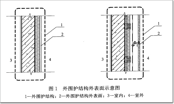 “外表面”是指外圍護結(jié)構(gòu)的設計完成面,建筑外圍護結(jié)構(gòu)一般由墻體、保溫層、飾面層組成,設計完成面即裝飾面層外邊線;當幕墻作為外圍護結(jié)構(gòu)時,“外表面”為幕墻面板外邊線(見圖1)。