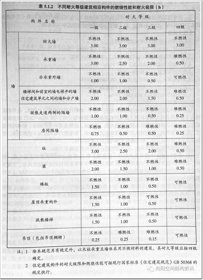 《建筑設計防火規范》GB 50016 中,表5.2.1為民用建筑的耐火等級所對應的建筑構件的燃燒性能和耐火極限。
