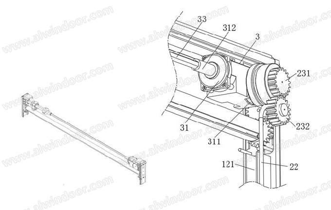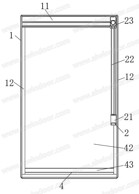 驅(qū)動組件2設(shè)于所述側(cè)框12的外部,所述驅(qū)動組件2不與所述側(cè)框12連接,所述側(cè)框12上無需設(shè)有給所述拉手21導(dǎo)向的導(dǎo)軌和凹槽。所述傳動組件3設(shè)于所述驅(qū)動組件2和所述卷簾組件4之間,用于使所述驅(qū)動組件2能夠帶動所述卷簾組件4。具體地,所述傳動組件3包括轉(zhuǎn)向機(jī)構(gòu)31和齒輪組32,所述轉(zhuǎn)向機(jī)構(gòu)31設(shè)于所述上框11內(nèi),所述控制機(jī)構(gòu)23與所述轉(zhuǎn)向機(jī)構(gòu)31相連接,所述轉(zhuǎn)向機(jī)構(gòu)31能夠?qū)⑺鼍砝K22的旋轉(zhuǎn)方向轉(zhuǎn)化為所述卷簾組件4的旋轉(zhuǎn)方向,所述轉(zhuǎn)向機(jī)構(gòu)31與所述齒輪組32連接,所述轉(zhuǎn)向機(jī)構(gòu)31能夠帶動所述齒輪組32進(jìn)行轉(zhuǎn)動,所述卷簾組件4包括卷簾管41和簾體42,所述卷簾管41的兩端與所述齒輪組32連接,所述卷簾管41的側(cè)部與所述簾體42連接,所述卷簾管41旋轉(zhuǎn)時,能夠帶動所述簾體42繞著所述卷簾管41轉(zhuǎn)動,所述卷繩22帶動所述轉(zhuǎn)向機(jī)構(gòu)31旋轉(zhuǎn)時,所述齒輪組32能夠帶動所述卷簾管41轉(zhuǎn)動,所述卷簾管41轉(zhuǎn)動時能夠帶動所述簾體42展開或卷收,從而實(shí)現(xiàn)對所述簾體42的手動控制。