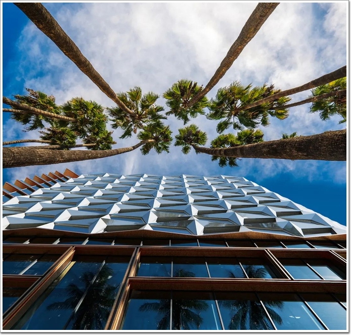被包裹在銀色動態網格之中的,則是由多個模數構成的大小不一的銅質內核——陽臺、構架和巨柱均被銅板所裹覆,在加州灼熱的陽光下,建筑整體顯得愈發溫暖與熱情,淋漓演繹好萊塢與夢工廠的電影質感和夢幻氛圍。