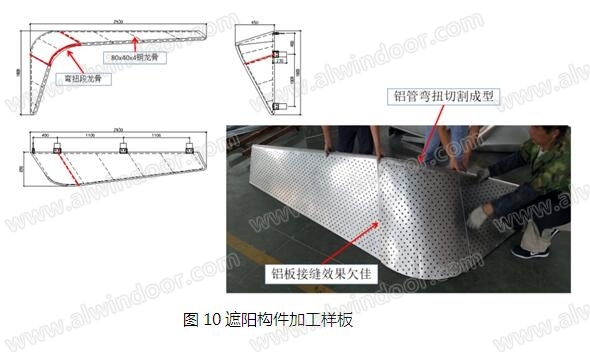 遮陽件的彎弧過渡區(qū)域,為扭曲造型(雙向曲面)。傳統(tǒng)工藝中,可考慮鋁板彎曲(詞條“彎曲”由行業(yè)大百科提供)成型,或用鋁圓管(φ50)彎扭、對剖切割。方案理論上可行,但通過樣板驗(yàn)證;因構(gòu)件彎曲半徑小,尺寸多,加工成本高,不能滿足工期要求。