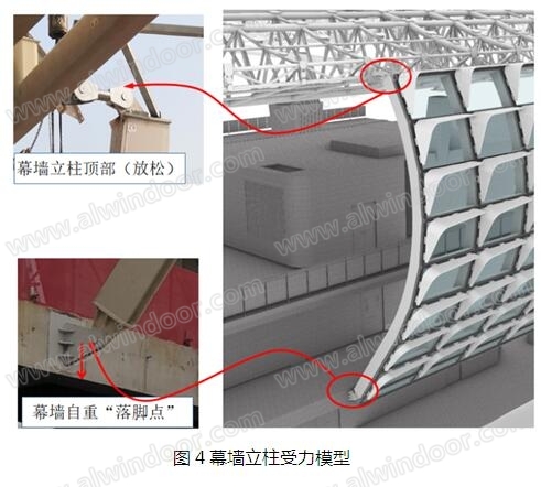 場館類建筑的屋面結(jié)構(gòu)形式,通常為鋼結(jié)構(gòu)網(wǎng)架結(jié)構(gòu),不承受立面維護(hù)結(jié)構(gòu)的重量;幕墻重力由立柱底部混凝土結(jié)構(gòu)梁承擔(dān),立柱為承壓構(gòu)件。常規(guī)設(shè)計(jì)是立柱底部開圓孔(鉸接),頂部開長圓孔(滑動連接)。本工程幕墻具有“雙向圓弧曲面造型”的特點(diǎn),立柱安裝方向多;為保證加工及施工的便捷性;立柱的頂部設(shè)置不銹鋼連桿。立柱底部,通過銷軸、耳板,與主體結(jié)構(gòu)梁(預(yù)埋件(詞條“預(yù)埋件”由行業(yè)大百科提供))固定;立柱頂部,通過銷軸、不銹鋼連桿、耳板與鋼屋架連接。主體結(jié)構(gòu)梁、幕墻網(wǎng)架、不銹鋼連桿、鋼結(jié)構(gòu)屋架依次鉸接,使幕墻龍骨系統(tǒng),形成“二連桿機(jī)構(gòu)”;實(shí)現(xiàn)幕墻自重落地,減小幕墻自重對屋面結(jié)構(gòu)的影響。