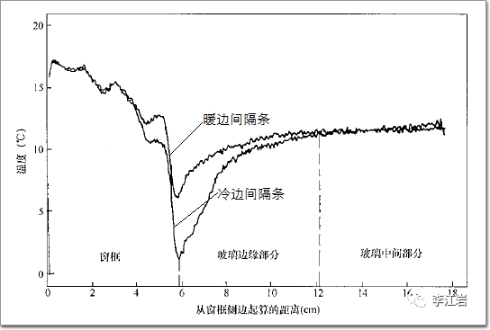 由于金屬材質的冷邊間隔條在玻璃嵌入框體的部位形成了熱橋,我們對典型的住宅窗戶室內測表面溫度進行紅外探測后發現,玻璃與框體交界的區域溫度通常會較低,主要是由于冷邊間隔條熱橋影響,一般影響范圍在距離框邊63mm以內的區域。通過紅外成像檢測的熱流分布如圖3所示;通過曲線圖可以看出,相同條件下,使用暖邊間隔條可以有效提高室內測表面溫度。