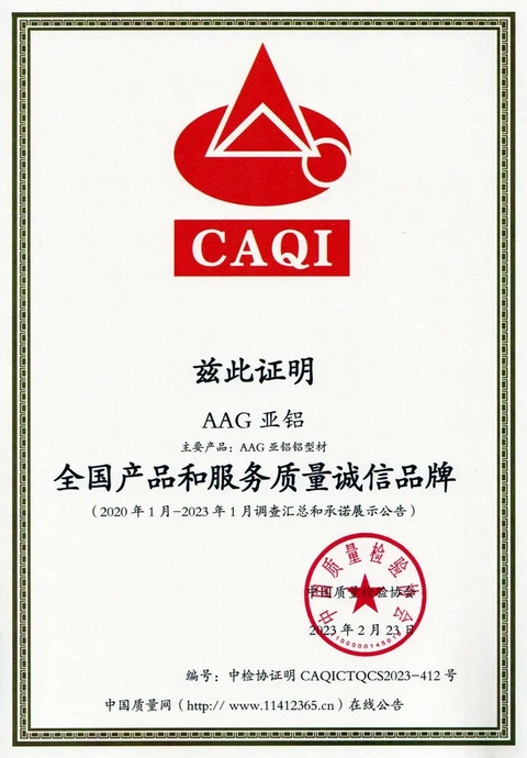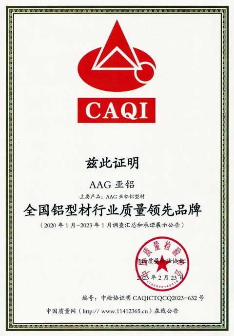 近日,由中國質量檢驗協會授權認證。AAG亞鋁憑借過硬的產品質量與誠信經營的企業理念連獲2020—2023年“全國產品和服務質量誠信品牌”和“全國鋁型材行業質量領先品牌”兩項榮譽,又一次用質量和誠信鑒證了品牌實力,詮釋了我司的“多元化服務”內涵!事實上,亞鋁從2002年起正式獲評“國家質量穩定合格產品”到2023年保持“全國質量誠信領跑品牌”,至今已在全國質量標桿之路問鼎21年!質量就是我們企業的命脈線,質量就是我們所向披靡的產品力!