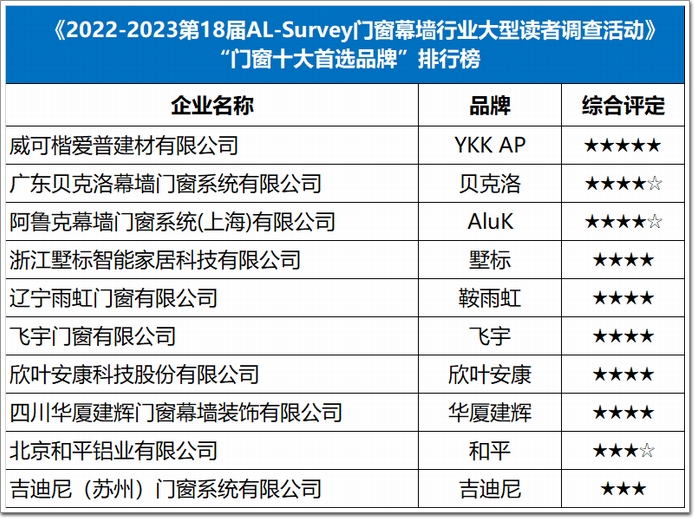 根據2022-2023年度“第18次門窗幕墻行業數據統計工作”的調查分析,以下的門窗生產企業及品牌上榜“門窗十大首選品牌“榜單。