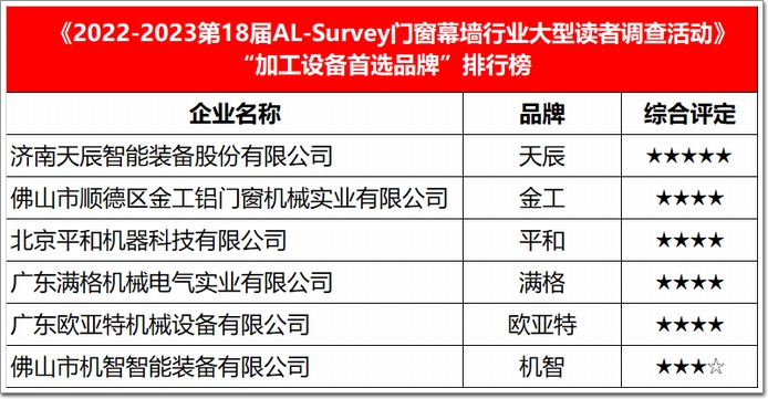 根據2022-2023年度“第18次門窗幕墻行業數據統計工作”的調查分析,以下的設備生產企業及品牌上榜“加工設備首選品牌“榜單。