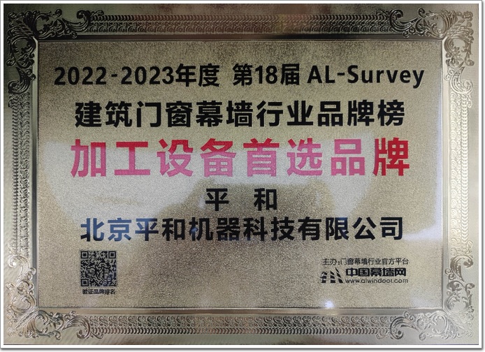 “加工設備智能先鋒”北京平和機器科技有限公司憑借全面的智能產品、科技生產線,門窗、幕墻創新技術,最終贏得廣大終端客戶、行業專家、設計院、顧問公司和媒體總編的高度認可,成功衛冕“加工設備首選品牌”大獎!