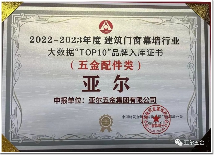 亞爾五金創新能力突出,憑借潛心的研發、高端的品質、通過產品、技術與服務的升級煥新,在滑撐、鉸鏈、窗控,以及防火、智能等方面產品性能突出。最終在品牌評選中脫穎而出,榮獲“五金配件十大首選品牌”,及大數據“TOP10”(五金配件類)品牌入庫證書。