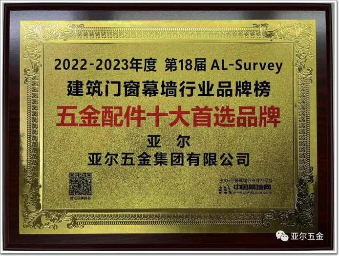“亞爾五金”榮獲2023五金十大首選品牌