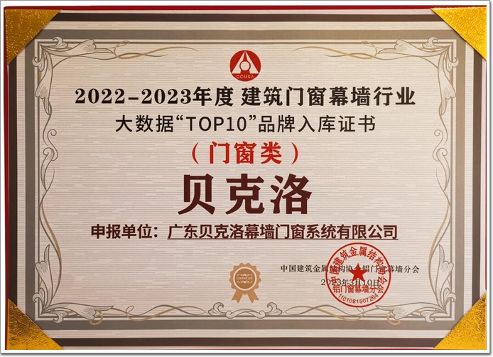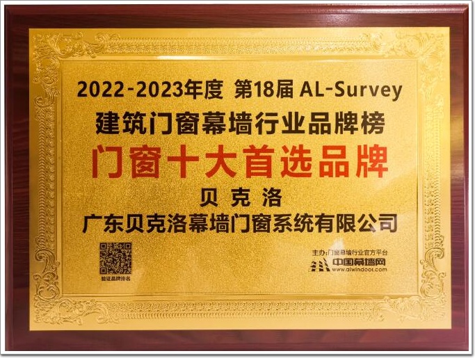 貝克洛榮獲2022-2023“建筑門窗幕墻行業大數據TOP10品牌入庫證書”