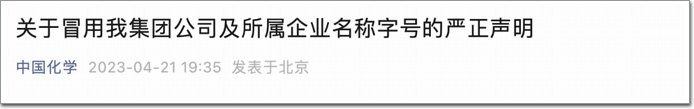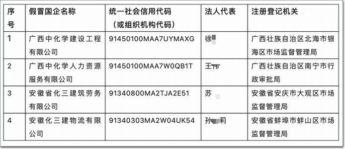 近期,經我集團排查和核實,發現下表所列公司及其下設各級子公司冒名使用“中化學”等字號,均為假冒國企,與我集團無任何隸屬或股權關系,也不存在任何投資、合作、業務等關系,其一切行為均與我集團無關。請社會公眾提高警惕,注意防范風險,如發現其違法犯罪行為,請盡快到公安機關報案。