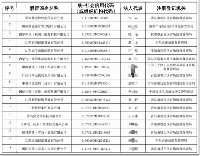 4月10日晚,國家能源投資集團有限責任公司(下稱“國家能源集團”)公告稱,近期,有不法分子通過偽造相關材料等方式,將企業注冊為國家能源集團下屬子公司,以國家能源集團下屬子公司名義開展業務。經集團核實,以下公司及其下設各級子公司均為假冒國企,與國家能源集團無任何隸屬或股權關系,也不存在任何投資、合作、業務等關系,其一切行為均與國家能源集團無關。請社會各界提高警惕,注意防范風險,如發現其違法犯罪行為,請盡快到公安機關報案。