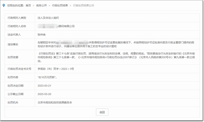 北京市規劃和自然資源委員會對某設計院進行了行政處罰。某規劃院某項目未取得規劃許可證變更批復的情況下,未按照規劃許可證批準內容及行政主管部門提供的規劃設計條件進行設計,向建設單位提供用于施工的全專業的設計圖紙。處罰依據:《行政處罰法》第三十七條“實施行政處罰,適用違法行為發生時的法律、法規、規章的規定。”