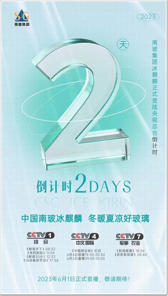2023年6月1日,中國(guó)南玻集團(tuán)冰麒麟玻璃正式登陸中央電視臺(tái)CCTV-1頻道,并以“中國(guó)南玻冰麒麟,冬暖夏涼好玻璃”產(chǎn)品形象亮相,后續(xù)還將登陸CCTV-4和CCTV-7。