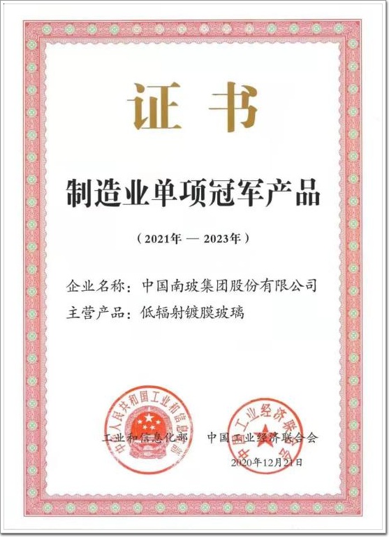 南玻集團(tuán)低輻射鍍膜玻璃(Low-E鍍膜玻璃)單項(xiàng)冠軍產(chǎn)品證書(shū)