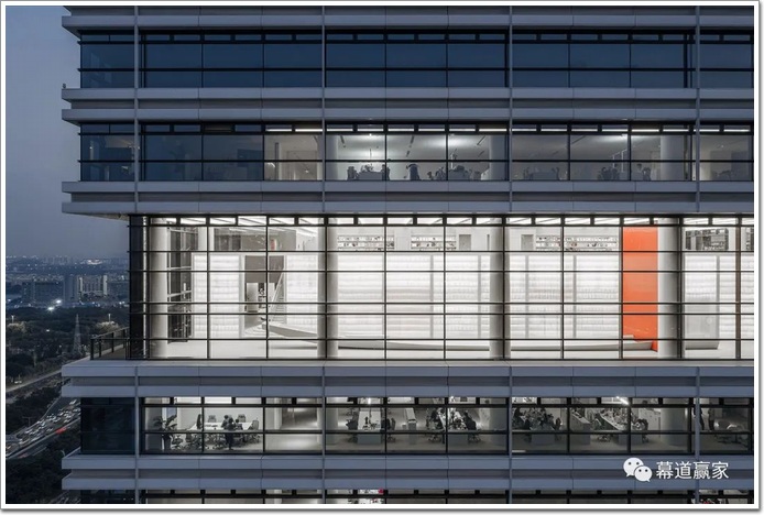 設(shè)計(jì)師試圖將圖書館變成精巧復(fù)雜的“人間世”——一個(gè)抽象的港口城市;進(jìn)而引導(dǎo)其間讀者通過閱讀一本書,進(jìn)入豁然開朗的悟道。遠(yuǎn)看玻璃大樓18層和19層,一個(gè)燈火通明的白色港口城市。