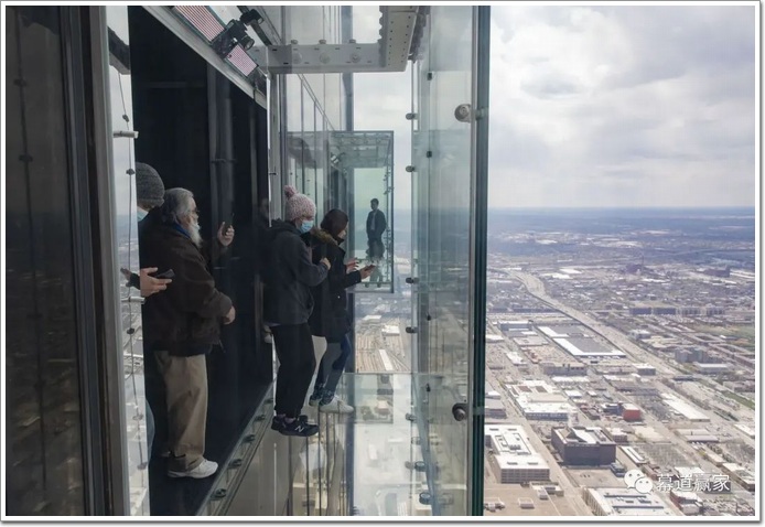 傾斜玻璃觀景臺是一排 8 個(gè)巨大的向下可動傾斜玻璃窗。盒子由三層3/8英寸(32毫米)厚的玻璃組成。當(dāng)游客站在格子間上之后,觀景臺的液壓系統(tǒng)會使整個(gè)觀景臺向下傾斜33度。相當(dāng)于在下面的芝加哥街道上傾斜 1000 英尺(305米)。很酷的部分是,當(dāng)窗戶向外傾斜時(shí),您可以掛在里面的扶手上,讓您感到非常匆忙。