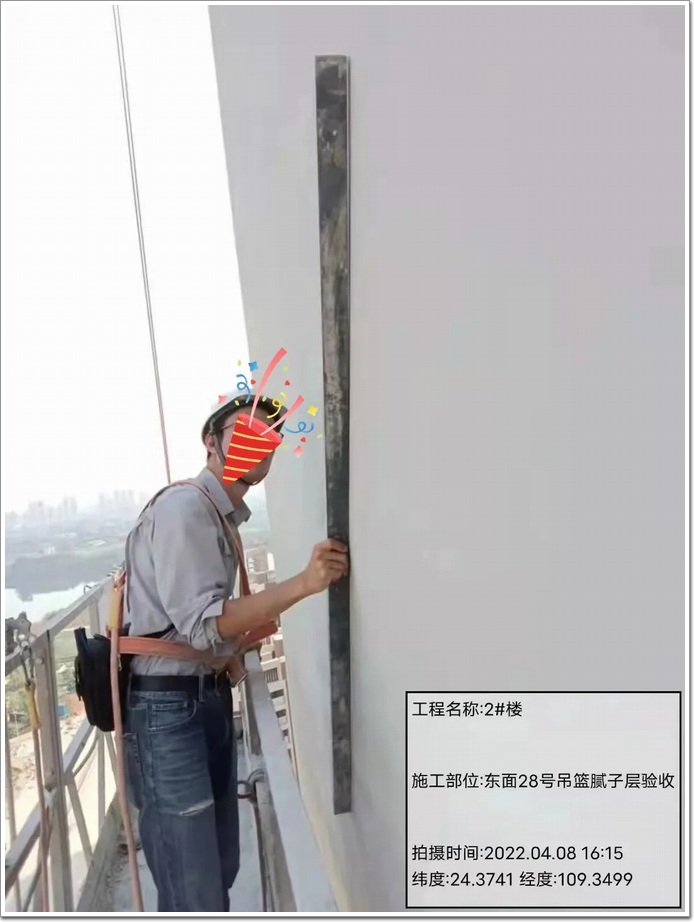 4.涂料大面施工前實測并整改:落架后,通過吊籃,對整體外墻的質量再進行實測實量,并進行二次整改,確保大面積觀感質量合格后,開展涂料工序的施工。