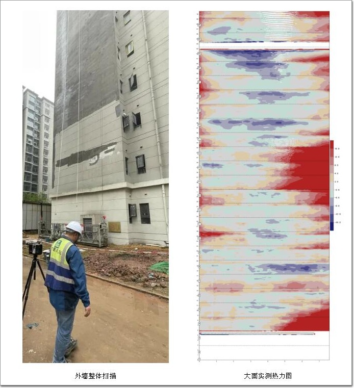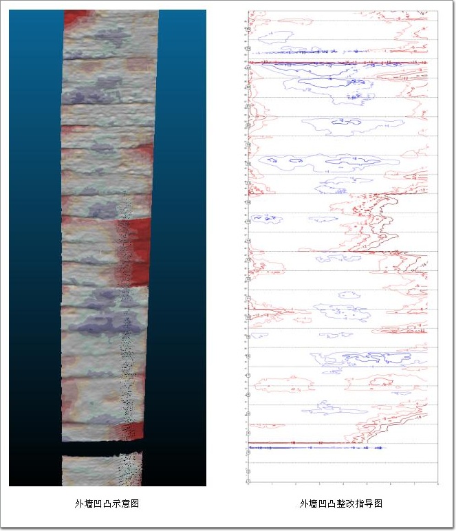 在爬架拆除后,外墻涂料施工前,使用長測距高精度三維激光掃描儀(有效測距350m)對外墻面進行整體掃描,獲取整體墻面的三維激光點云數據。對整體大幅的外立面進行表面平整度和垂直度的分析,大面排查外墻潛在觀感缺陷風險,并輸出“外墻大面實測熱力圖”和“外墻凹凸整改指導圖”,有效指導外墻整改。