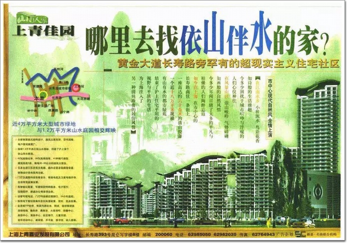 上青佳園當年宣傳的時候,就是用這個“突兀”的假山來宣傳的,那時候,廣告上最顯眼的一句話就是:“靠山的房子,金街和長壽路兩旁的超現實主義住宅區,就能讓你如愿以償。”2001年,上清佳苑的房價在3900到5200元之間,和現在的房價相比,已經是天壤之別了。