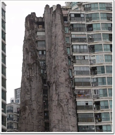 另外一說是由于建好后不久出現了地基下沉的情況,開發商為了加固樓體,在外造了一座形似假山的加固物,直達15樓。從外面看,仿佛樓體被包裹在一座高聳的假山里。