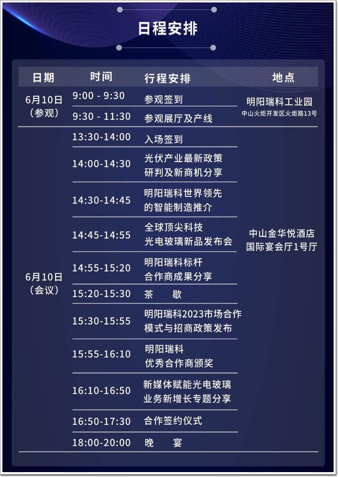 “光”之未來,共創(chuàng)“明”天——本次大灣區(qū)站活動將于2023年6月10日在廣東省中山市舉行,我們期待您的參與,活動請聯(lián)系“明陽瑞科”官方公眾號并關(guān)注明陽集團舉辦的“光電玻璃2023年品牌招商大會”,讓我們一起攜手喚起更大的中國力量,同享新能源紅利!引領(lǐng)趨勢,把握商機!