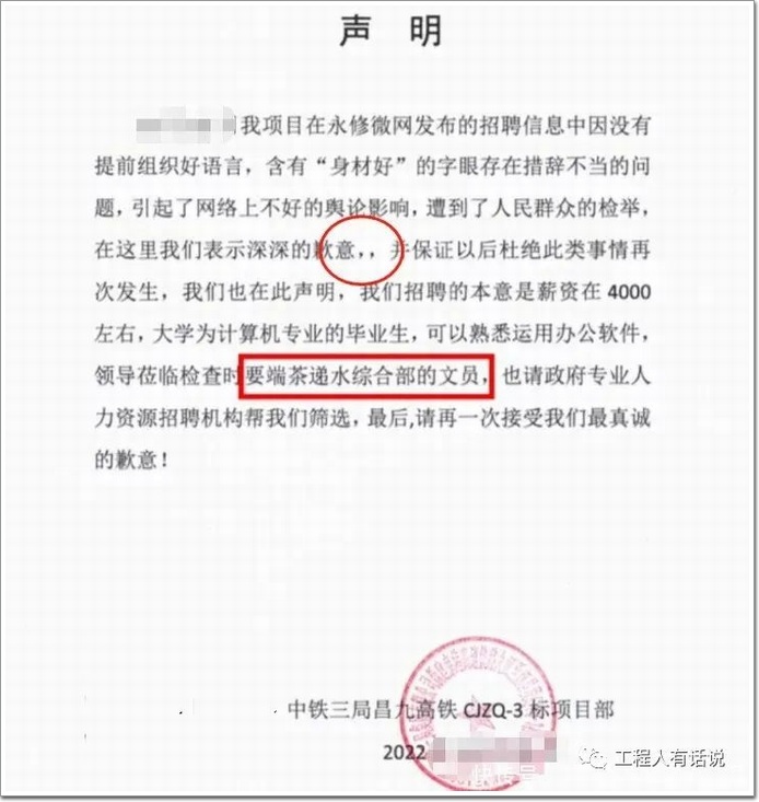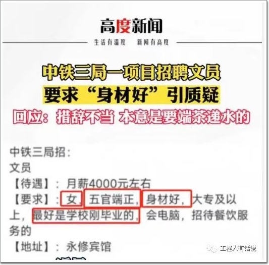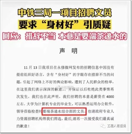 江西永修中鐵三局一項目招聘文員要求“身材好”引質疑,中鐵三局相關工作人員回應:措辭不當,本意是要端茶遞水的。