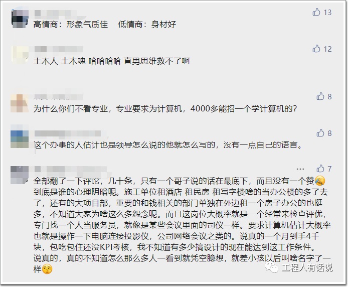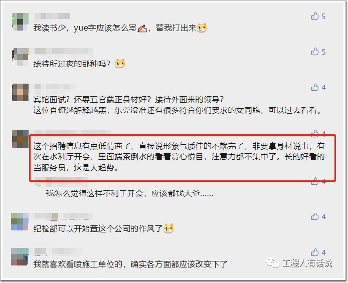 突然有點懵,這是招員工,還是招小蜜。端茶倒水要身材好,難道不該找個體力好,會來事的么。更何況,就是一個項目部,不好好干工程,招什么端茶倒水的,是伺候業主,還是伺候監理。
