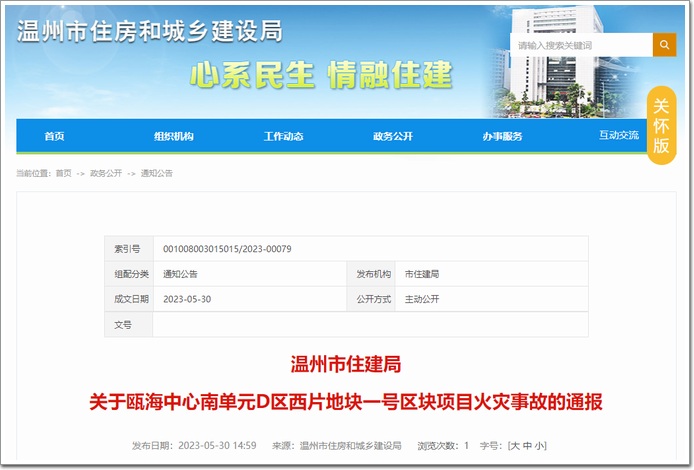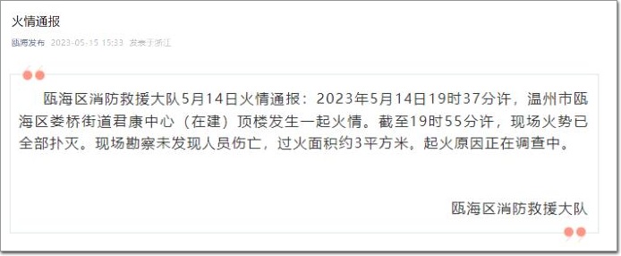 近日,溫州市住建局發(fā)布《關(guān)于甌海中心南單元D區(qū)西片地塊一號(hào)區(qū)塊項(xiàng)目火災(zāi)事故的通報(bào)》(通報(bào)原文詳見(jiàn)文末)。