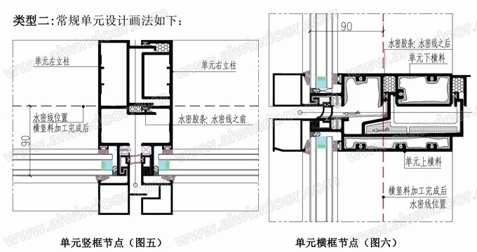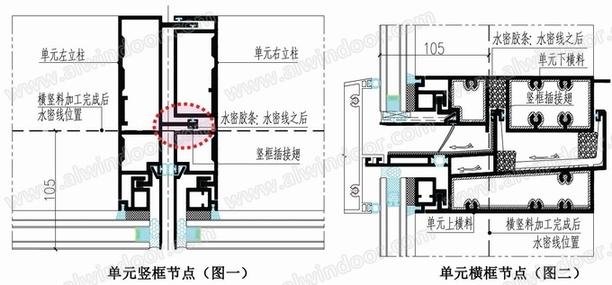 類型二的單元豎框插接的前道插接翅沒有被銑掉(如圖二十二中紅色虛線所示),在左右豎框間形成的間隙被泡棉封堵(圖七中的泡棉不可省,且在底端要剪切使之變薄以便與橫向密封線對齊),在整個平面內形成了環形密封,無密封間斷點存在,豎向膠條在外側形成密封,橫向膠條在內側形成密封,存在三個等壓腔。所以從這一點上來說,類型二的單元水密性更高。