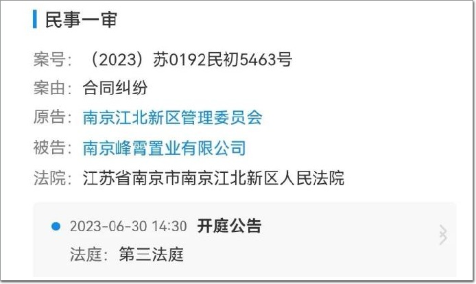 就在張玉良山東行之后,6月30日,南京江北新區管理委員會與南京峰霄置業有限公司的合同糾紛案正式開庭審理。