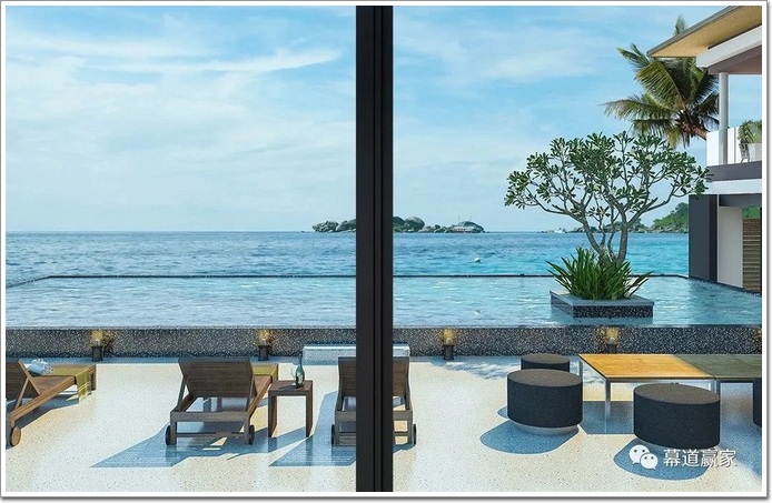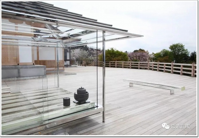 在無視覺障礙的全玻璃茶室里,眺望遠處的黃昏海景或山景時,非常容易精神升華。升華為“明心見性”后的暢適!