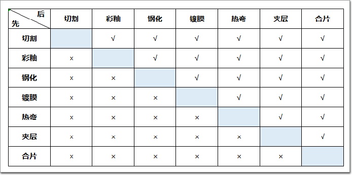 由于玻璃的各項深加工工藝,會造成其物理化學性能改變,彼此之間存在一定的先后順序關系,表中所列為各項加工工藝,相互之間的先后順序及可行性。