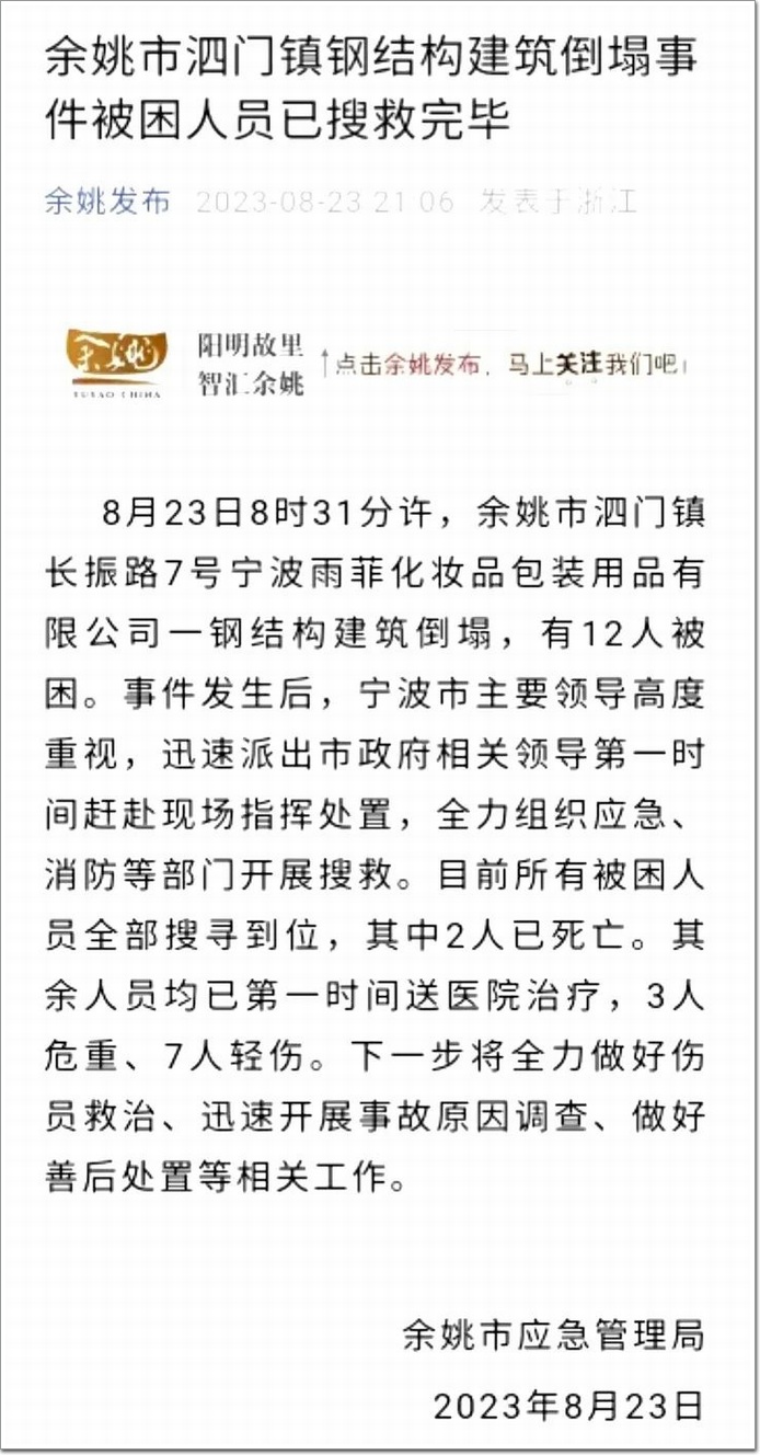 轉(zhuǎn)自【余姚發(fā)布】8月23日8時(shí)31分許,余姚市泗門鎮(zhèn)長振路7號(hào)寧波雨菲化妝品包裝用品有限公司一鋼結(jié)構(gòu)建筑倒塌,有12人被困……