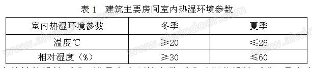 《近零能耗建筑技術標準》GB/T 51350對建筑室內主要房間熱濕環境參數要求見表1所示,居住建筑內噪聲晝間≤40dB(A),夜間≤30dB(A)。