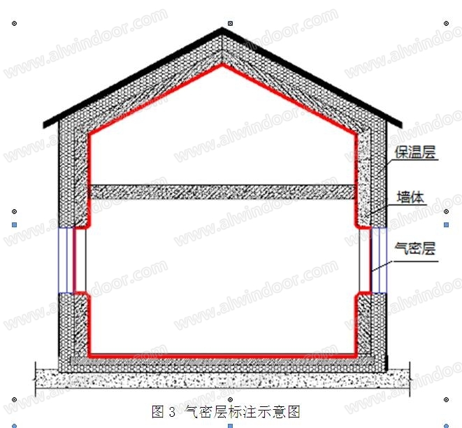 建筑物氣密性是影響建筑供暖能耗和空調能耗的重要因素,對實現近零能耗目標來說,由于其極低的能耗指標,由單純圍護結構傳熱導致的能耗已較小,這種條件下造成氣密性對能耗的比例大幅提升,因此建筑氣密性能更為重要。良好的氣密性可以減少冬季冷風滲透,降低夏季非受控通風導致的供冷需求增加,避免濕氣侵入造成的建筑發霉、結露和損壞,減少室外噪聲和室外空氣污染等不良因素對室內環境的影響,提高居住者的生活品質。建筑圍護結構氣密層應連續并包圍整個外圍護結構如圖3所示。