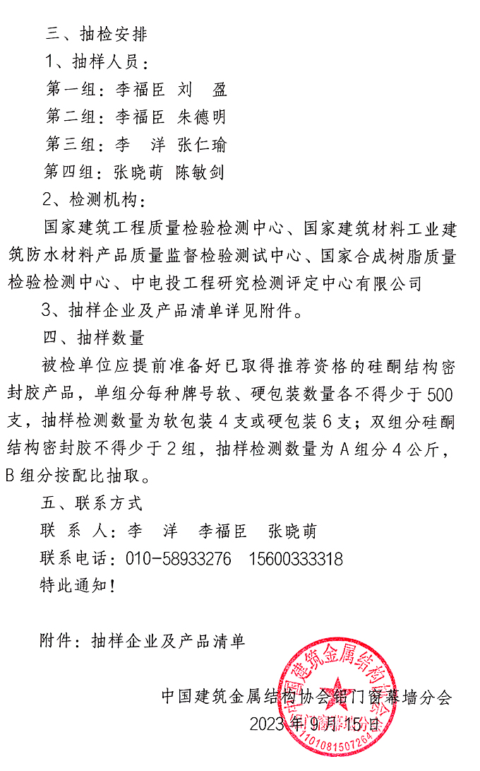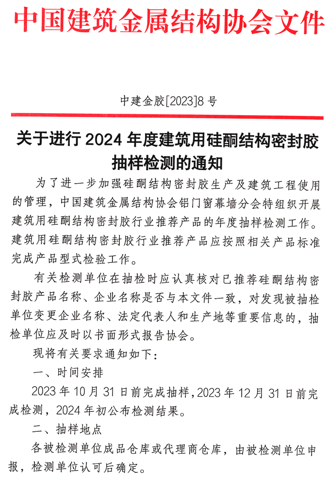 關(guān)于進(jìn)行2024年度建筑用硅酮結(jié)構(gòu)密封膠抽樣檢測(cè)的通知
