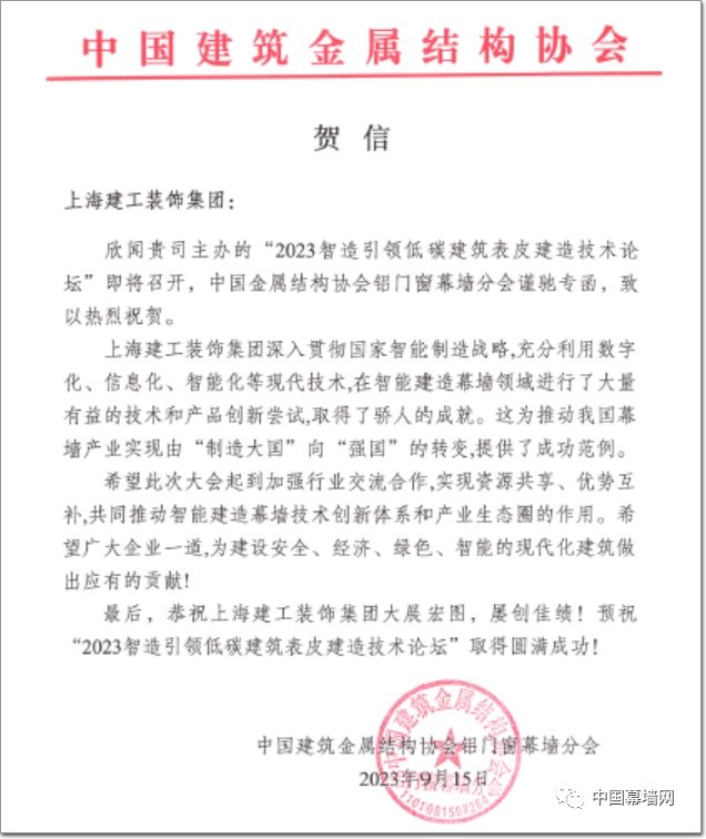 本次論壇的舉辦,還得到了“中國建筑金屬結構協會鋁(詞條“鋁”由行業大百科提供)門窗幕墻分會”的大力支持,分分會長李福臣特此發來賀信,送上行業協會的期望與祝愿!