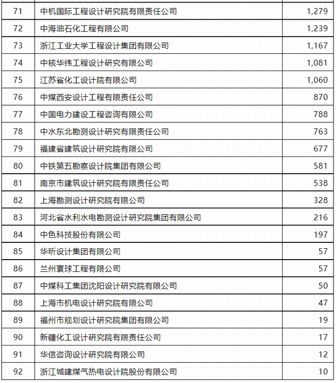 其中,工程項目管理營業額排名92家企業上榜,中國石化工程建設有限公司以186,585萬元人民幣營業額繼續位居榜首;工程總承包營業額排名186家企業上榜,中國電建集團華東勘測設計研究院有限公司以4,447,229萬元人民幣營業額位居榜首;境外工程項目管理營業額排名42家企業上榜,中國鐵路設計集團有限公司以37,515萬元人民幣營業額位居榜首;境外工程總承包營業額排名74家企業上榜,中國石油工程建設有限公司以1,315,651萬元人民幣營業額位居榜首。