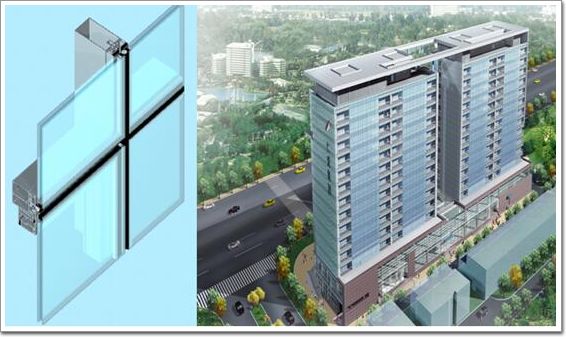 4. 半單元式幕墻 是先在主體結構上安裝豎框或豎框與橫梁組成的框架,豎框和相鄰豎框對插,通過對插形成組合桿。單元組件(裝飾面板)再固定在豎框或橫梁上。一般有兩種結構形式:一種是豎框先安裝在主體結構上,豎料上裝有掛接板塊的裝置,橫梁與面板材料組成單元板塊,板塊掛接豎料上。豎向接縫在豎框上,橫向采用上下單元板塊對插接縫,進行接縫處理,形成整片幕墻。另一種是豎框與橫梁組成框架,固定于主體結構上,面板組成獨立的小板塊,掛接于框架上。豎向接縫在豎框上,橫向接縫在橫梁上,并進行接縫處理,形成整片幕墻。