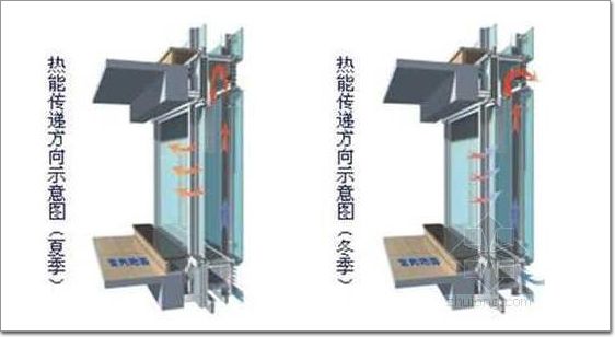 換氣過程―――夏季,出風口開啟,依據熱壓(詞條“熱壓”由行業大百科提供)原理(煙囪效應),冷氣會從進風口進入雙層幕墻的空氣緩沖層;進行熱交換后,熱空氣從出風口排出。若內層幕墻開啟,也可將室內頂部的熱空氣同時排出。冬季,出風口關閉,空氣緩沖層在溫室層的作用下,緩沖層溫度會高于室外,從而也提高內層幕墻外表面溫度,這樣會大大降低室內熱損失。
