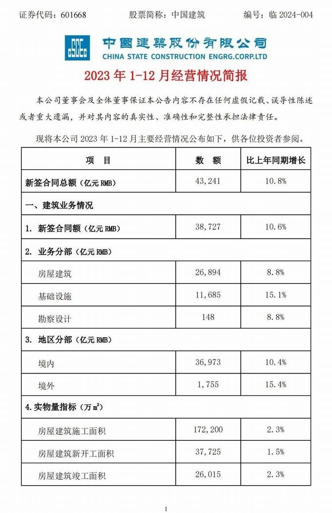 近日,中國建筑股份有限公司(以下簡稱:中國建筑)發布企業 2023 年 1-12 月經營情況簡報。