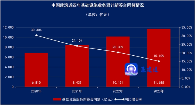 作為中建集團轉型升級的重要抓手,基礎設施業務的業績一直處于穩步提升中,四年時間里,其新簽合同額從 2020 年的6810 億元,到2022 年底順利突破萬億大關,2023 年,基礎設施業務經營業績再創新高,實現新簽合同額11685 億元,同比增長 15.1%,成為幾大業務中同比增幅最大的板塊,進一步加快了集團轉型升級的步伐。