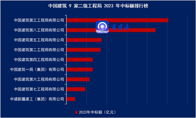 根據隧唐科技基建通經營管理AI 云平臺數據統計,2023 年中國建筑9 家工程局的項目中標總額排名情況為:中建三局>中建八局>中建五局>中建二局>中建四局>中建一局>中建六局>中建七局>中建新疆建工。經過一整年的不戳經營,中建三局重回中建集團二級工程局中標排行榜首把交椅!