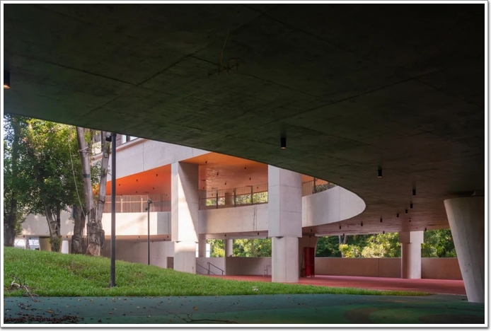 設計將操場逆時針扭轉15°,在場地西南側形成放大的入口廣場和更加宜人開放的公共共享城市界面。抬升至一層高的操場與教學樓裙房延伸相接的看臺,整合了校園中重要的室內外運動文化設施和開放空間。建筑體型進一步分裂、抬升,連續的空間活動圈“THE LOOP”串聯起一系列尺度高低各不相同的架空層,提供了視野極佳的第二地面。鼓勵師生之間的交流、共享與碰撞隨時隨地自然的發生。