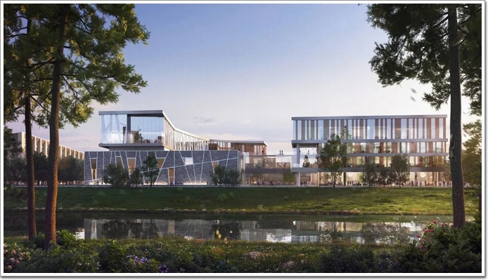 因此設計以灣區環境和教育模式為出發點,充分利用土地優勢,形成“一核一帶多組團”規劃布局,核心建筑對角向兩側緩緩收縮和升起,不對稱的起伏形態如同大海中的朵朵浪花,營造一個與海洋共融共生的學習社區。