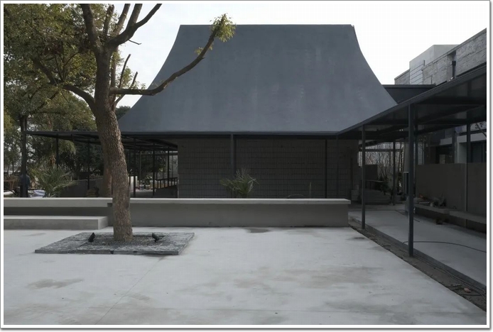 在有限的用地范圍中,將入口曲廊、餐飲、會議、畫廊、客房等功能分布在木回廊四周,通過廊道與其相連。西側尺度較小的合院圍繞一棵老梧桐產生對話,與回廊共同形成空間格局中最重要的兩個院落。新、老建筑分別采用了與當地窯磚尺寸相同的陶磚與老紅磚作為外墻材料,結合暖色混凝土營造出新與舊的和諧共生。