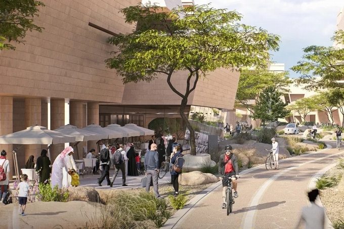 「New Murabba」社區里是一片流水潺潺、綠意盎然的景象。要知道沙特的森林覆蓋率一直維持在0.5%的水平,這是用鈔能力在缺水的沙漠中造了一個綠洲奇跡。
